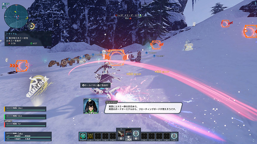 | トライアル発生 | そのあたりにエネミーが集結しつつあるみたいです! 数が増えるまえに、倒しちゃってください。 |
