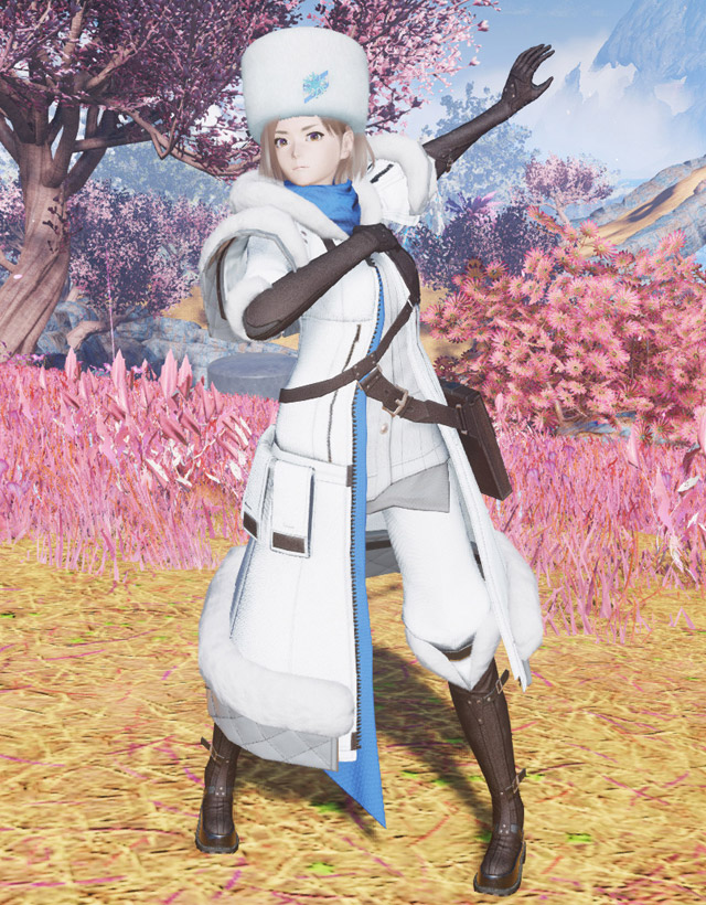 装飾1は各所のボア部分(もこもこ)首、腕、裾、膝のすべてが外れる、装飾2はベルトと腰のポーチ。フード部分がかなり後ろに出っ張っており、一部のロング系のヘアスタイルと干渉する。ボリュームのあるやつなら干渉しないかも。 --