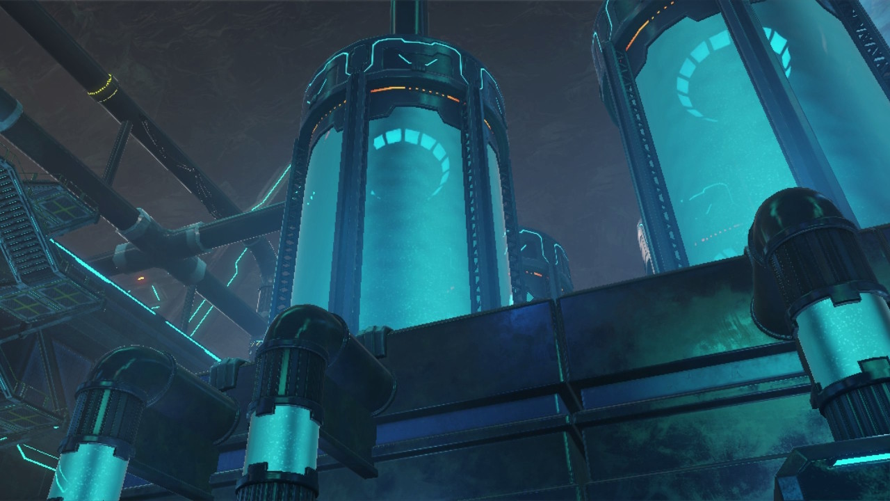 巨大なタンクのような構造物のいくつかには、青いジェル状の液体が満たされている。