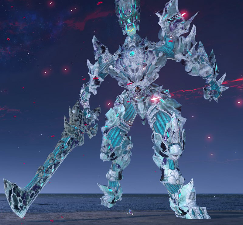 巨大な武器による打撃の他、頭・胸部からのレーザーなど中~遠距離攻撃が豊富。
