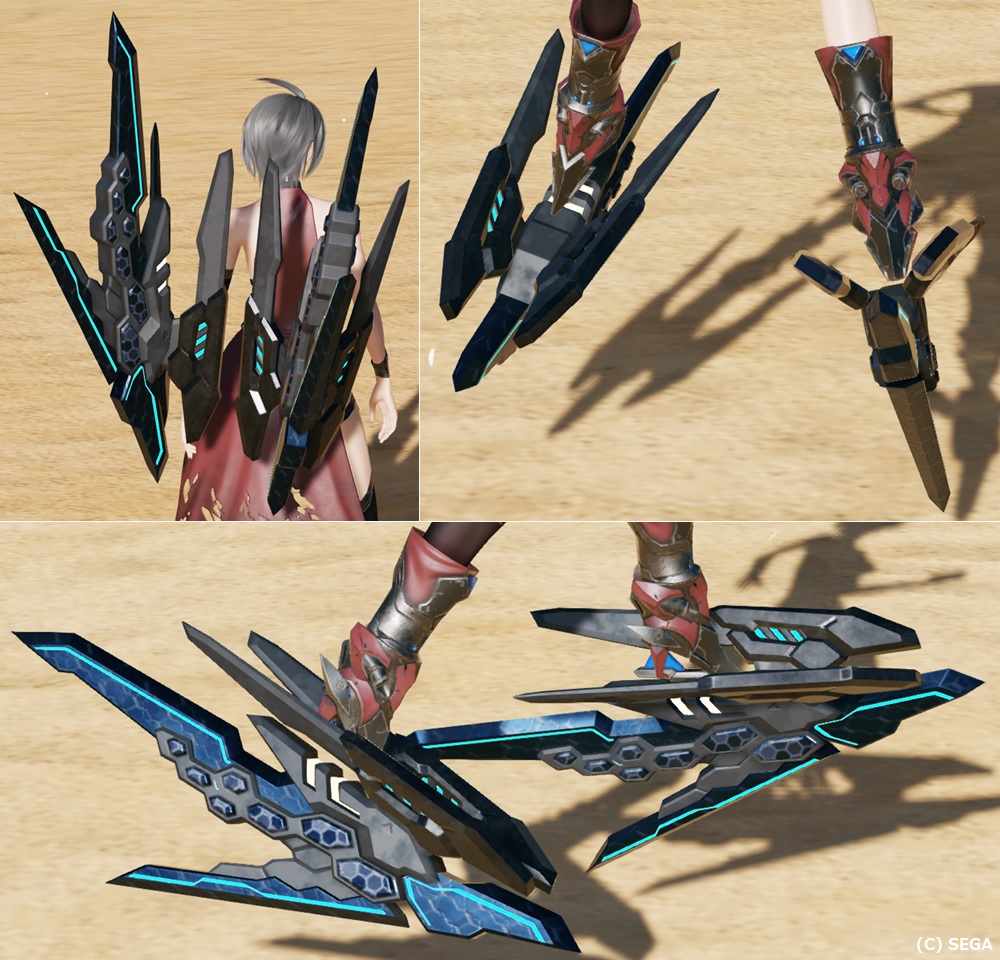トレイニアなどの建造物の素材で作られた武器。ハニカム形の規則的なパーツが特徴で、黒光りする刀身や固い質感が無機質で、不思議な雰囲気を感じさせるデザインになっている。