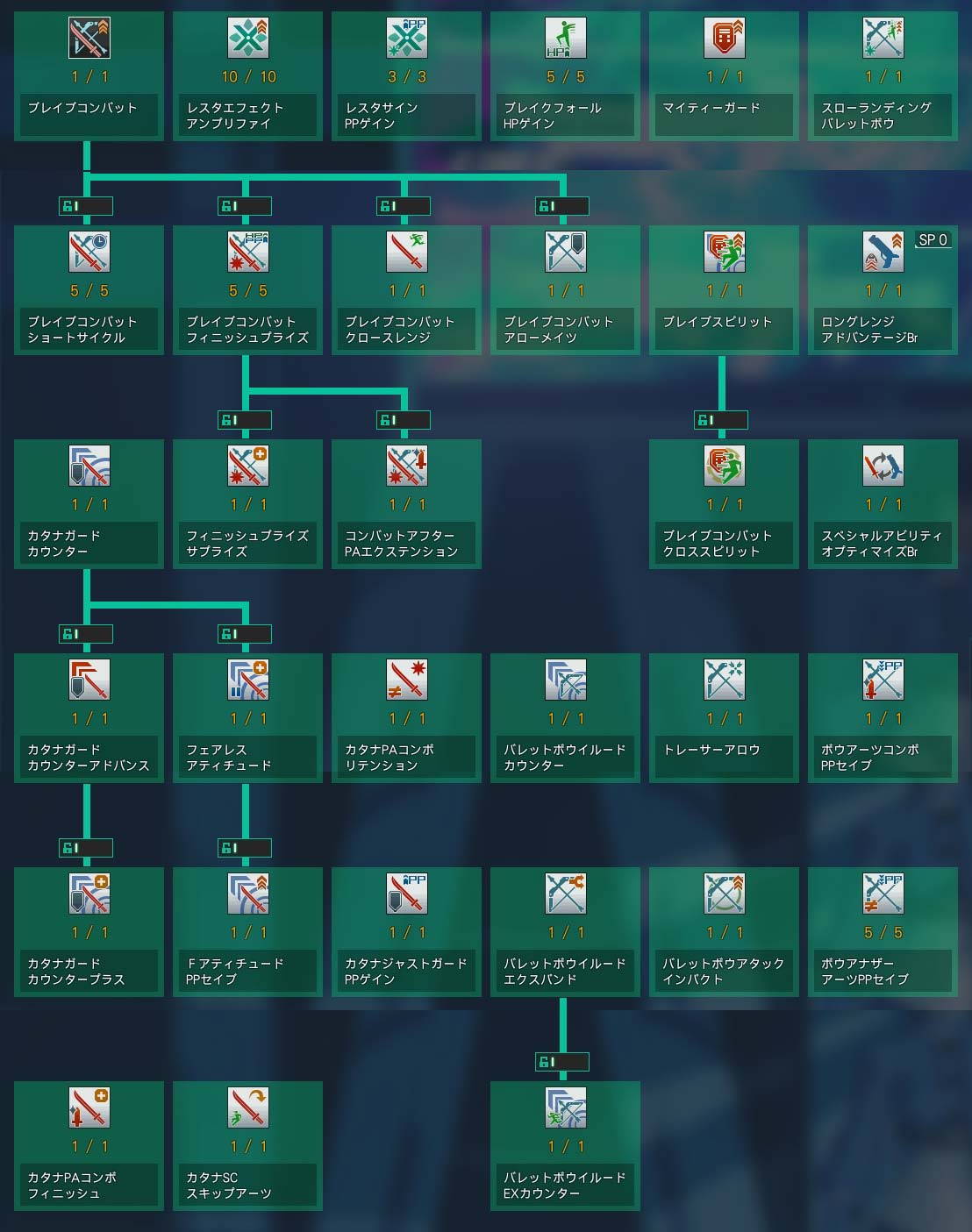 BrSl 元のBrスキルによりカタナと弓を併用できるようになったため、ガンスラッシュ側のスキルやPAに頼る必要性は薄いが、PAシフティングスピカ、ウェービングリゲルのムーブアーツはBrの苦手な縦軸の高度調整手段になるため、これらを取り入れるのであれば射撃補正に装備補正を寄せて置くとより扱いやすくなる。 |