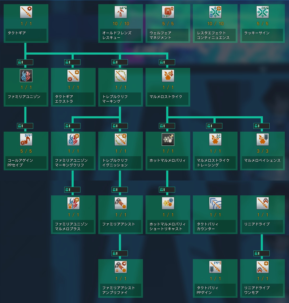 ファミリアアシストの発動中に、さらに同スキルを発動するたびに、一定時間、そのギアゲージの蓄積量が増加する。